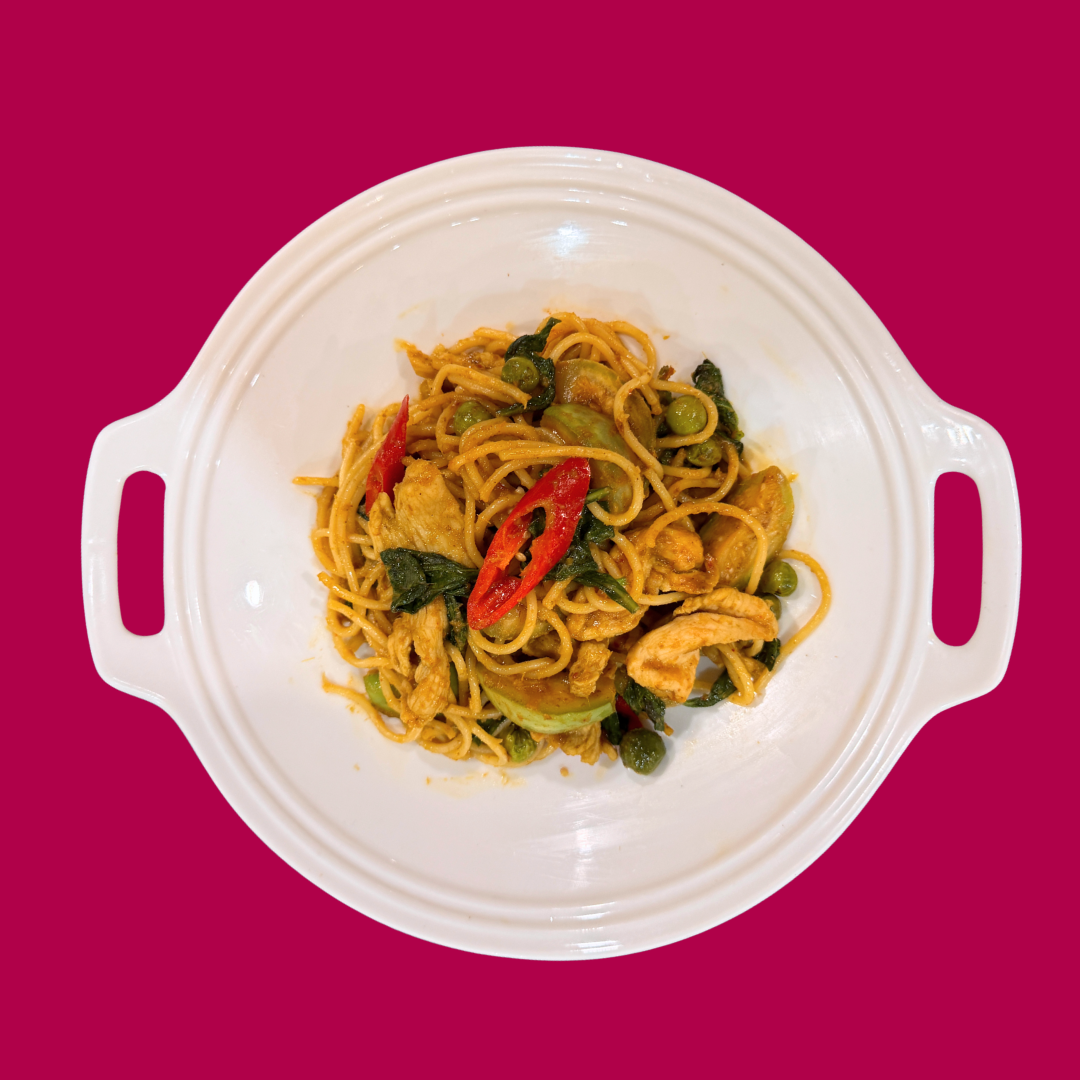 Creamy green curry tossed with spaghetti and your choice of protein.